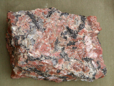 Rocha composta por feldspato rosa, epidoto verde e quartzo incolor, criando padrões manchados de rosa e verde únicos.