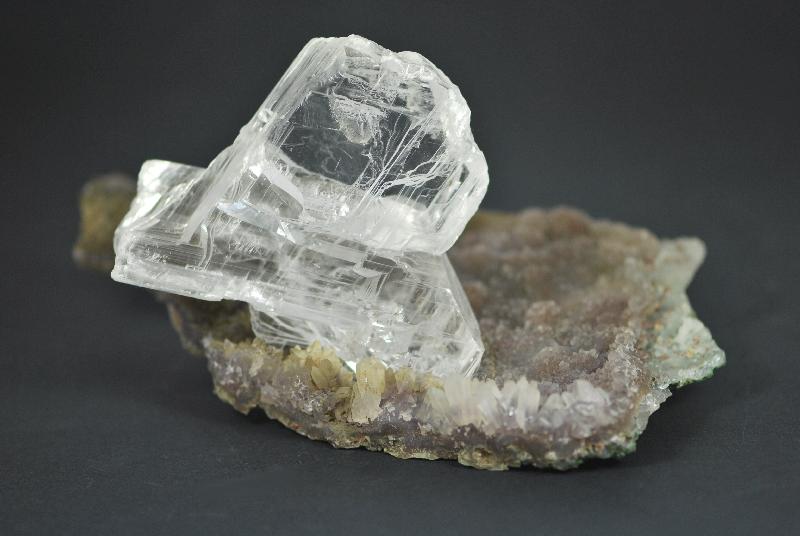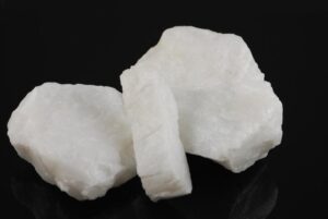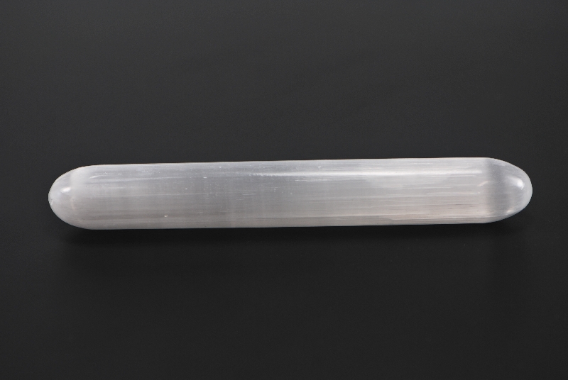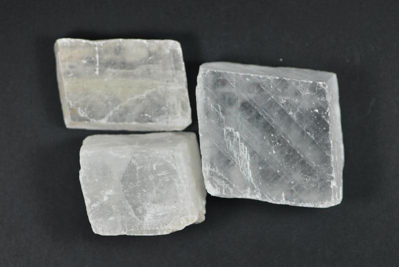 Variedade cristalina transparente a translúcida da gipsita, de brancura lunar e brilho sedoso. Muito macia — pode ser riscada com a unha.