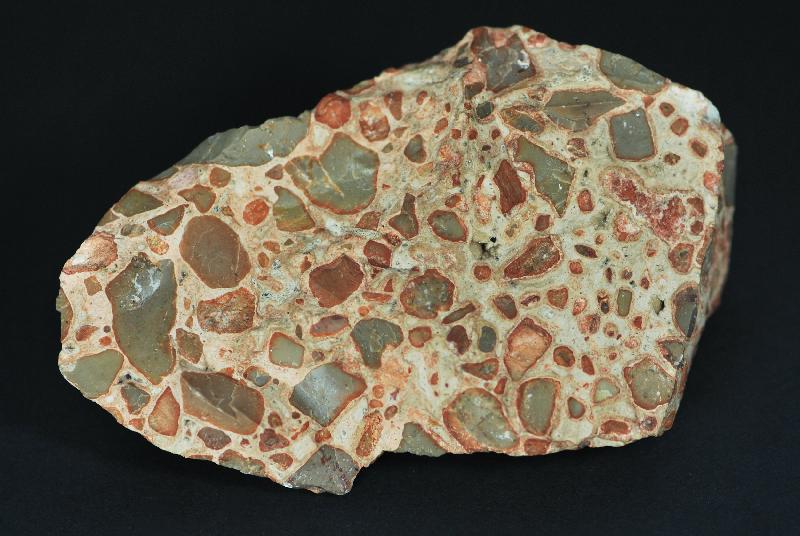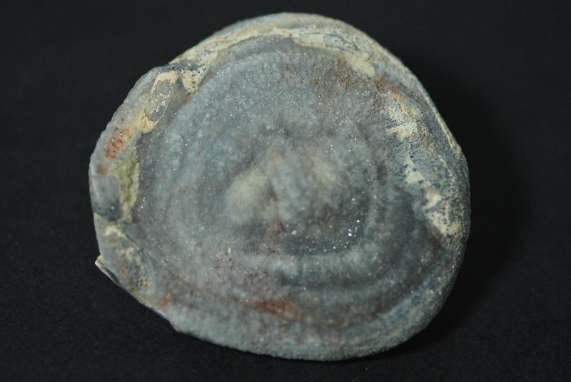 Calcedônia com a combinação de vermelho-amarronzado, preto e branco em faixas distintas.